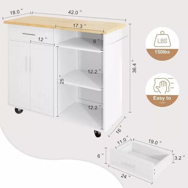 Our kitchen island cart stands out with its solid wood construction, ensuring durability and a touch of elegance. The large worktop measuring 42″ L x 18″ W provides ample space for food preparation and culinary tasks. Below, a combination of a spacious cabinet, drawers, and adjustable shelves offers versatile storage options. Keep your kitchen essentials organized, from small appliances to utensils and linens.